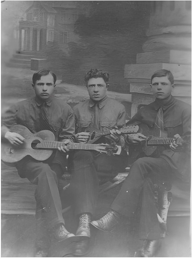 Ну и, конечно, фотографии из бабушкиного альбома. Вот музыкальное трио: молодые деревенские парни в нарядных рубашках, с галстуками и в начищенных ботинках сидят “нога на ногу” на скамье, в руках у двоих – гитары, у одного – мандолина. Справа и слева два Александра: мой будущий дед и бабушкин старший брат, а в середине Иван – бабушкин воздыхатель.