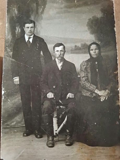 Старший брат моей бабушки Михаил Ильич с родителями Ильей Матвеевичем и Марией Прокофьевной. Фото 1907 г.