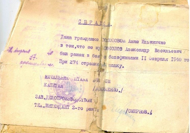 12 марта 1940 г. кончилась война, а дедушка все не возвращался. За всю войну бабушка не получила от него ни одного письма. Похоронки тоже не было. О последних часах жизни мужа моя бабушка узнала из краткого рассказа его однополчанина, вернувшегося с Финской войны: они оба были ранены в бою 11 февраля 1940 г. и отправлены в медсанбат. В ночь на 15 февраля финны напали на госпиталь, началась эвакуация тяжелораненых, а легкораненые красноармейцы, в числе которых был мой дед (он был ранен в руку), заняли оборону. В этой мясорубке дедушка и сгинул.