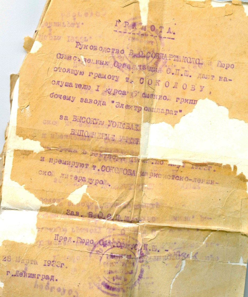 "Руководство В.О. СОВПАРТШКОЛЫ и Бюро Общественных Организаций С.П.Ш. дают настоящую грамоту т.Соколову , слушателю 1 сменной группы, рабочему завода "Электроаппарат" за высокую успеваемость и выполнение учебных заданий с сентября 1932г. по март 1933 г. и премируют т. Соколова марксистско-ленинской литературой.