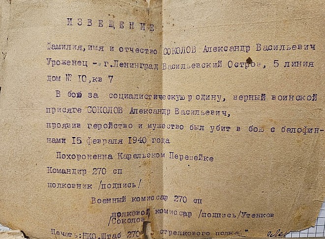 В похоронке, хранящейся у нас дома, сообщается только, что дедушка был ранен 11 февраля боях с белофиннами и погиб 15 февраля 1940 г. И все. Больше никаких подробностей.