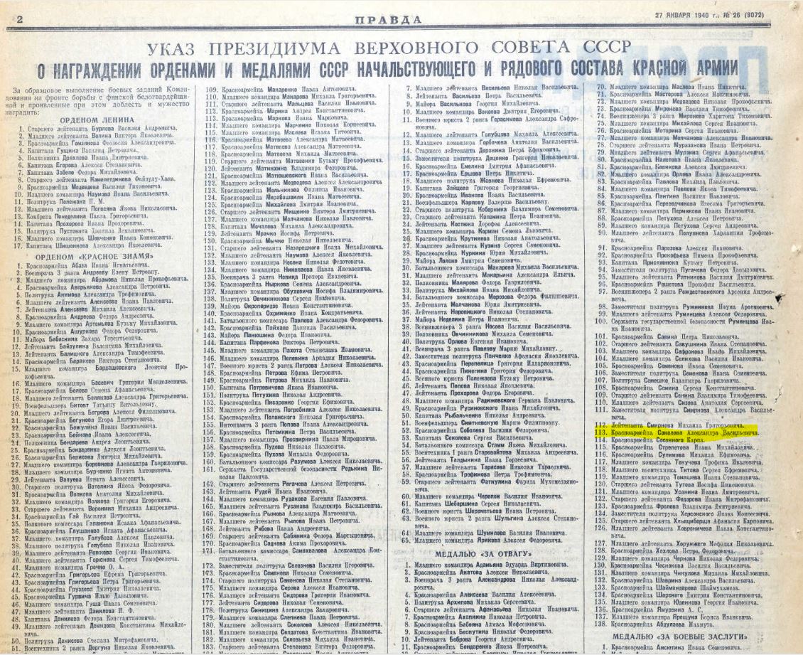 А вчера я нашла в интернете скан газеты "Правда" от 27.01.1940 с указом Президиума Верховного Совета СССР о награждении моего деда Александра Васильевича Соколова медалью "За отвагу" за образцовое выполнение боевых заданий Командования на фронте борьбы с финской белогвардейщиной и проявленные при этом доблесть и мужество.